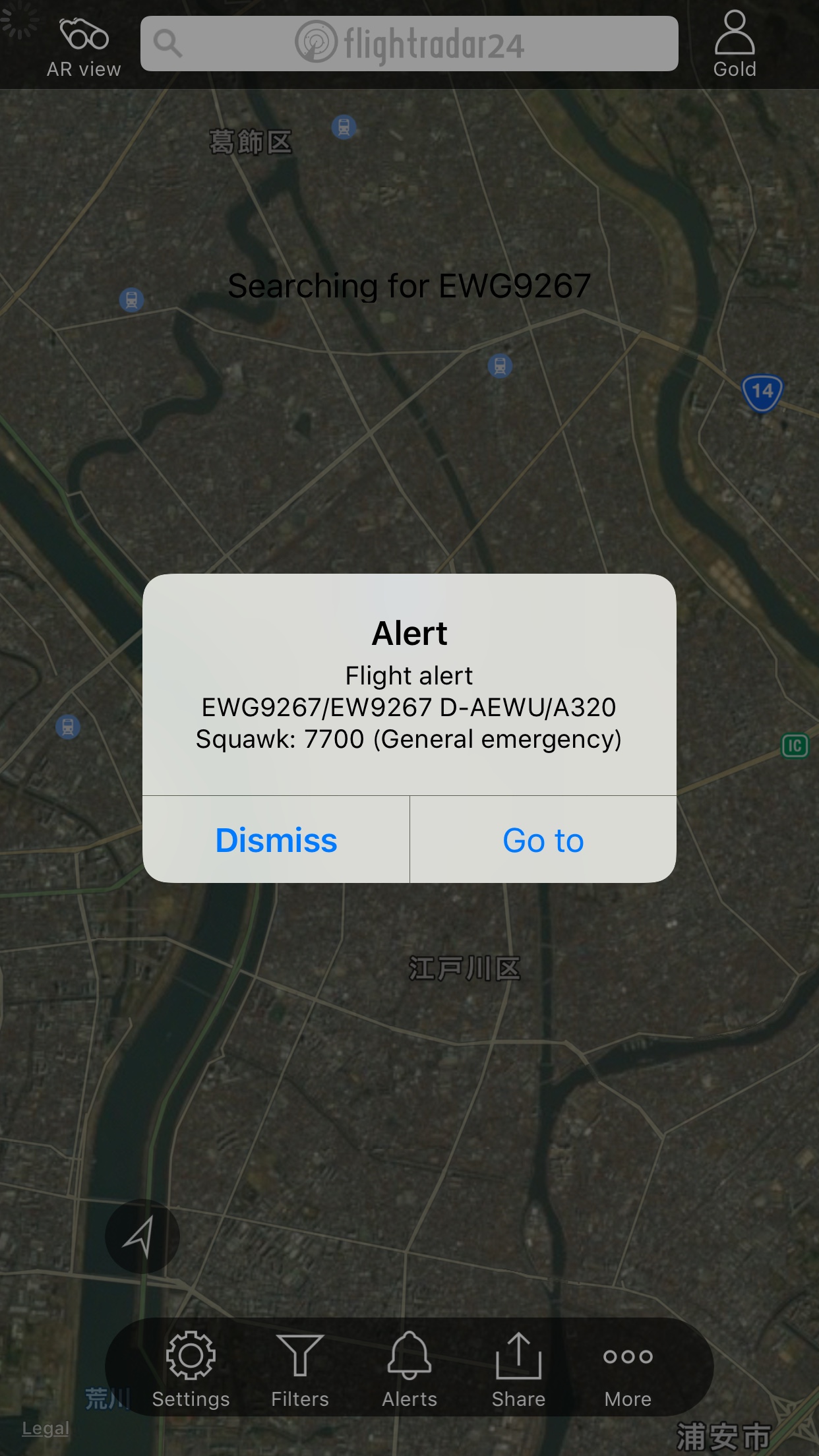 夜にたまたま外出していると、iPhoneに入れているFlightRadar24からスコーク7700の通知が来ました。